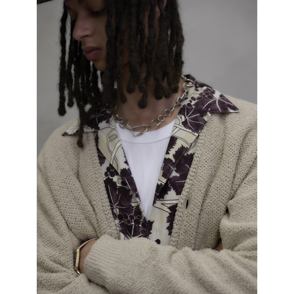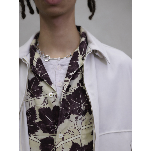 全開の柄シャツに人気のネックレスと